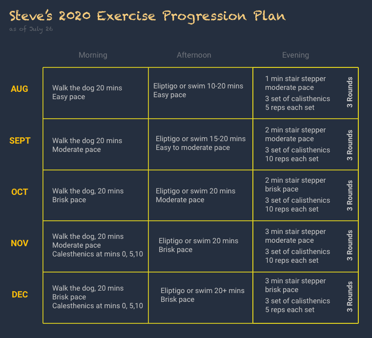 * The positive physical after effects (endorphins, elevated mode, etc)I have designed a program that is meant to be vigorous enough RELATIVE TO MY CURRENT FITNESS LEVEL to tap into the benefits above, but not so vigorous that I crash, based on the following principles